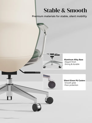 High-quality semi-aluminum silent casters, certified by SGS/Greenguard gold medal/TUV ergonomic standards.